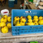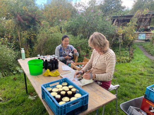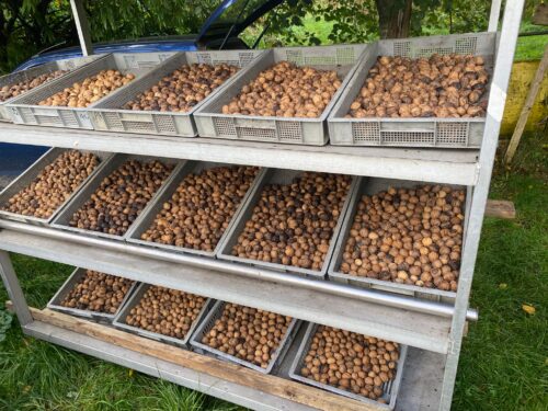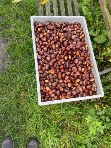 De laatste oogst is binnen… tamme kastanjes, walnoten, heeeel veel appels, kweekperen, kiwibessen… ongeveer twee vingerkootjes groot, ziet er hetzelfde uit en smaakt net zo lekker als gewone kiwi’s.